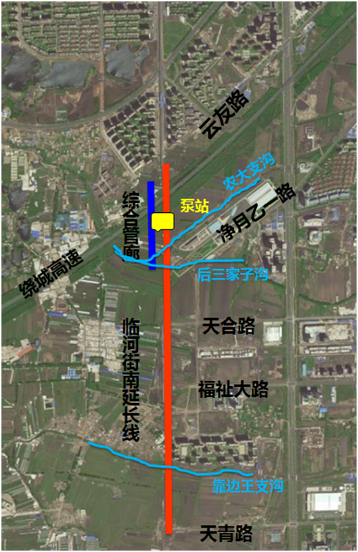 臨河街南延長線工程位于長春市南關(guān)區(qū),北起臨河街既有路南端(和美路),南止天青路,道路跨越南關(guān)區(qū)與凈月區(qū),途中穿越繞城高速、農(nóng)大支溝、后三家子溝、靠邊王支溝,道路設(shè)計車速40km/h,道路全長2839.919米,為通向凈月區(qū)域內(nèi)南北方向次干路。