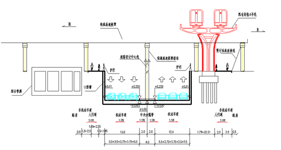 輕軌N23號承臺因修建高度較高,如將N23號承臺埋至車行道下,需采用極限縱坡4%,方可保證繞城高速下凈空4.6m,4%極限坡度段采用自融雪路面技術(shù),避免清雪不及時縱坡較大造成的行車?yán)щy。
