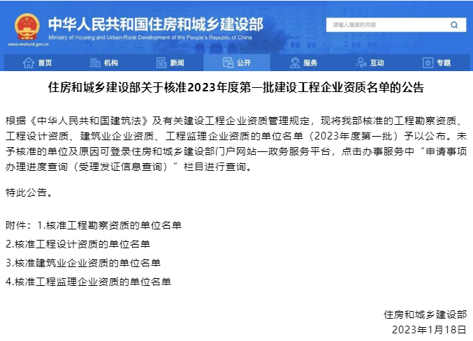 2023年1月18日,住房和城鄉建設部公布了關于核準2023年度第一批建設工程企業資質名單的公告。長春市市政工程設計研究院有限責任公司獲批市政(燃氣工程、軌道交通工程除外)行業甲級資質。此項資質在吉林省范圍內共4家企業擁有,我公司位列其中。