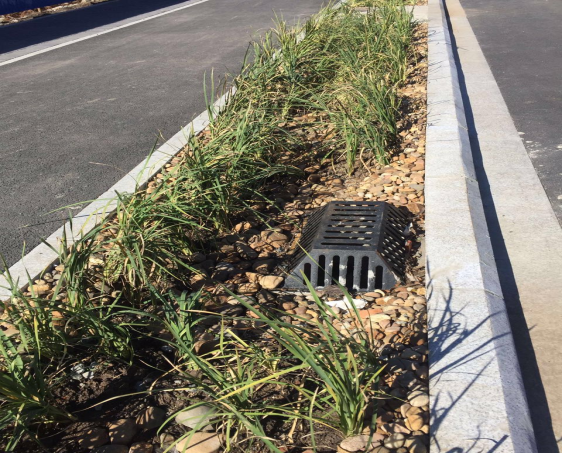 本工程踐行低影響開發(fā)設(shè)計(jì)理念,廠區(qū)通過(guò)設(shè)置下沉綠地、轉(zhuǎn)輸型植草溝、縫隙透水磚透水鋪裝、透水混凝土鋪裝、立緣石開口、溢流式雨水口、雨水井、環(huán)保型攔污籃及復(fù)合砂基礎(chǔ)攔污過(guò)濾槽等措施,以滿足徑流總量控制率指標(biāo)要求。