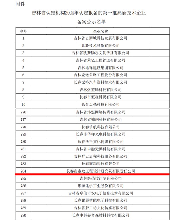 2024年11月1日,全國高新技術企業認定管理工作領導小組辦公室下發《吉林省認定機構2024年認定報備的第一批高新技術企業備案公示名單》,我公司被認定為吉林省2024年第一批國家高新技術企業。