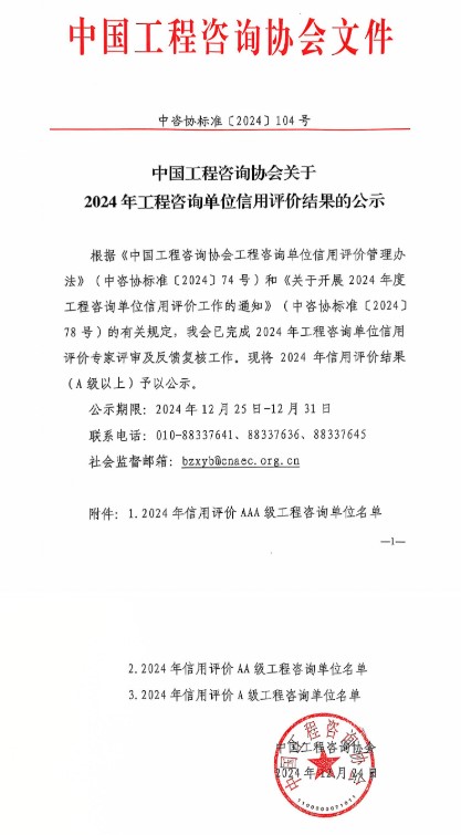 2025年1月1日,我公司首次被評為中國工程咨詢協會2024年信用評價AAA級工程咨詢單位。