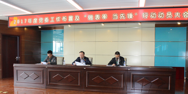 2017年4月26日,我院在8樓會議室召開了2017年度黨委工作布置暨‘做表率、當先鋒’行動動員大會。院黨委副書記金慈云主持會議,院領導班子、全院黨員、部門主管領導參加會議。會議共四項內容:一、黨委書記宋剛宣讀布置我院《2017年度黨委工作計劃》;二、李建國總工宣讀我院《“做表率、當先鋒”行動工作方案》;三、院班子成員向黨員“先鋒示范崗”授牌;四、黨委書記宋剛與院班子及各部門主管領導簽訂《黨風廉政建設一崗雙責責任狀》。會上,黨委書記宋剛對我院2017年黨建工作提出要求,要求各黨支部要深刻認識和理解習近平總書記 “黨建工作永遠在路上”的深刻內涵,黨建工作不能“刮一陣風”,要經常抓,抓經常,常抓不懈,適應黨建工作新常態;各黨支部和各單位要結合工作實際,創造性地開展黨建工作,把實際工作與黨建工作統一起來,兩手抓兩手都要硬,不僅要業務突出,黨建工作也要在行業內立起標桿。