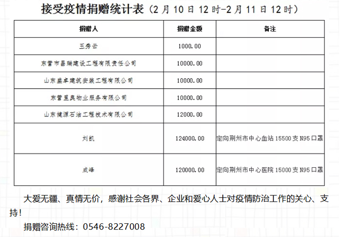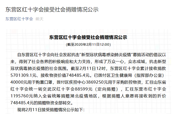 ▲2月3日東營(yíng)市紅十字會(huì)抗擊新型肺炎募捐統(tǒng)計(jì)公示